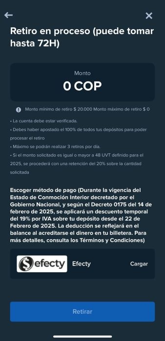 Toma en cuenta que para retirar se debe haber apostado el 100% de todos los depósitos. Esto significa que aunque haya saldo, si ese dinero no se ha apostado no se puede retirar.